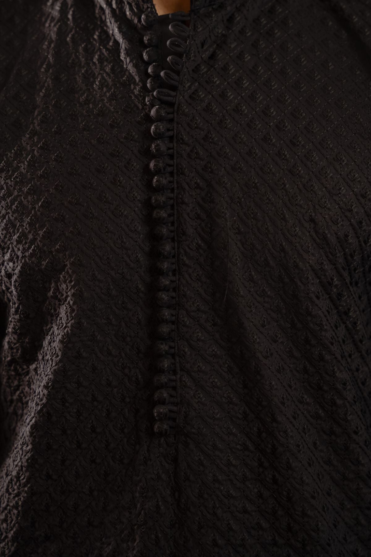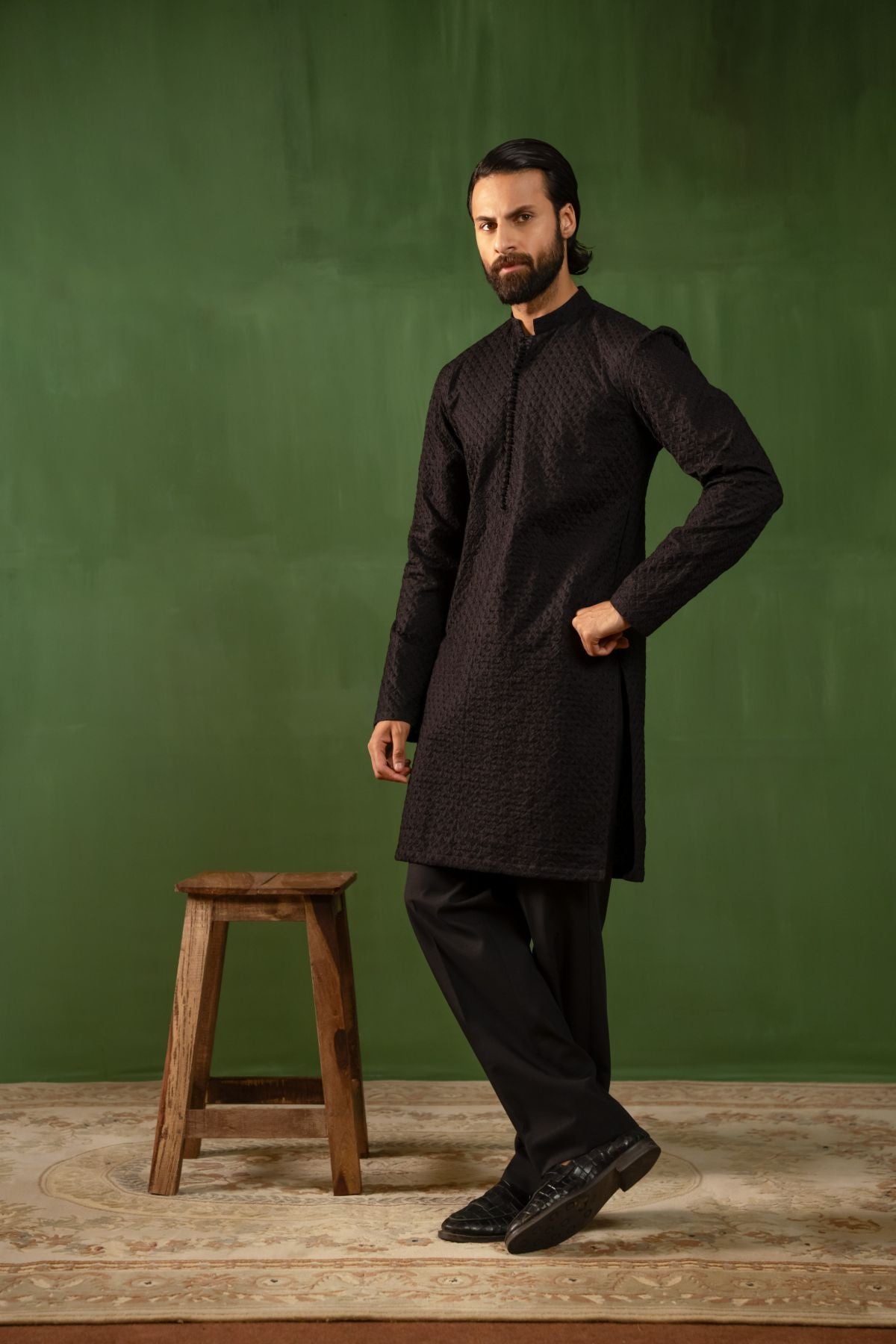 Step into effortless elegance with this black kurta trouser set, crafted from soft and breathable cotton fabric. The kurta features subtle, tonal embroidery along the button placket, adding just the right touch of sophistication without being overwhelming. Paired with a matching plain trouser, this ensemble is perfect for semi-formal gatherings, festive occasions, or refined everyday wear.